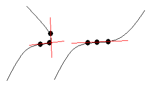 ![]() Figure 2. Two curves exhibiting C0 continuity on the left, and C1 continuity on the right. |