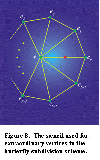 Unfortunately, this scheme had a similar problem in that it could lead the current vertex to being twice as far from where it started out from. Eventually a stencil was created by Zorin, Schröder, and Sweldens as an extension to the butterfly scheme to make the surface C1 everywhere [6]. The vertex’s new position is now determined by this stencil, and a new set of rules, where both ends of the current edge were taken into account. This new stencil was applied only to extraordinary vertices; ordinary vertices continued using the ten point stencil (see Figure 6).