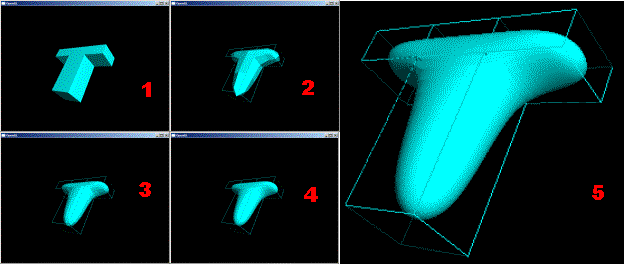 ![]() Figure 11. A mesh subdivided with the Catmull-Clark approximating scheme. The last image shows that the final surface extends outside of its base control net. |