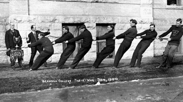 1910-11: College President Dr. A. P. McDiarmid presides over Brandon College Tug-o'-War Team