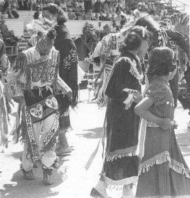 Dakota First Nation "grass dancers" and "jingle dress dancers" from Sioux Valley provide a cultural demonstration in front of the Grandstand at the Brandon Fair Grounds during the Provincial Exhibition, Brandon c. 1960 (courtesy McKee Archives)