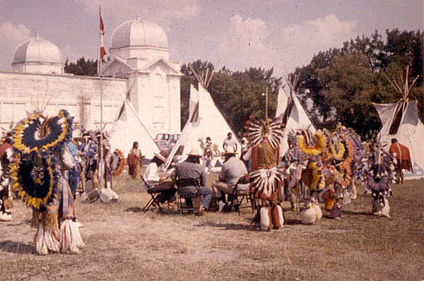 Dakota First Nation "fancy feather dancers" from Sioux Valley assemble outside tents at the Provincial Exhibition, Brandon c. 1960 (courtesy McKee Archives)