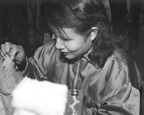 A First Nations woman sewing beads on a mukluk in a pattern common to Cree First Nation peoples during the Royal Manitoba Winter Fair c. 1960s (courtesy McKee Archives)