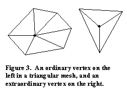 The number of edges that meet at a vertex is called the vertex’s valence (or its degree). When a triangular mesh is split up, most of the vertices are of degree six. Similarly, when we split up a quadrilateral mesh, most of the vertices are of degree four; these are referred to as ordinary vertices. An extraordinary vertex is one that is not of the standard degree in the given mesh. So for a triangular mesh, an extraordinary vertex could of degree three, four, or five.