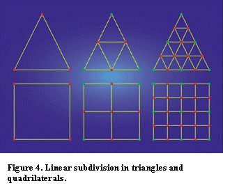 This scheme just subdivides the existing polygons in the mesh into more polygons. It does not provide any more than C0 continuity over the surface of the mesh. It is a uniform, stationary scheme with local support. It is also interpolating since it does not move any of the original vertices within the mesh. For triangular meshes, it is designed so that it splits a single triangle into four using the midpoints of the original triangle. Quadrilateral subdivision requires us to create a new vertex in the centre of the quadrilateral itself to create four new quadrilaterals for the mesh (see Figure 3).
