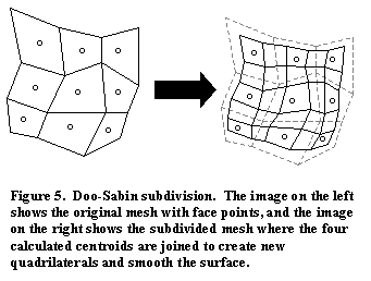 Using the centroid of a quadrilateral, and the midpoints of each edge, four centroids can be calculated. They used this information to create four points within the each quadrilateral. These four points could be used to create new quadrilaterals, which would be connected to their neighbours. This approximation gives the mesh the appearance that large chunks are being cut off the corners. If this is continued, we can approximate a smooth surface (see Figure 4).