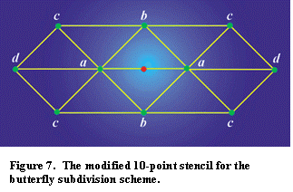 The parameter w is the tension parameter for this scheme. If w equals 0, c is left as -1/16, which just linearly interpolates the mesh; this leaves behind undesired sharp areas on the final surface. One solution theorized at one point was to use a 10-point stencil with a fourth parameter, d, which is just equal to w.